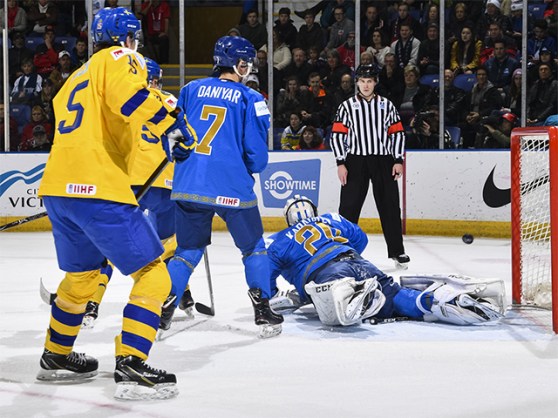 Both goalies made their World Junior debut. Sweden’s Ole Eriksson Ek got the win, while Kazakhstan’s Denis Karatayev got a workout. Final shots favoured Sweden 56-11.