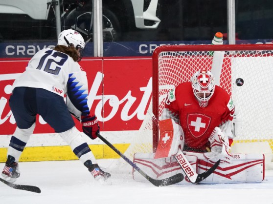 With a dazzling 55-save performance, Swiss goalie Andrea Brändli made sure it wasn’t a cakewalk for the U.S. on Day One. The defending champions had to work hard for their 3-0 victory over Switzerland in the third game at Calgary’s WinSport Arena.