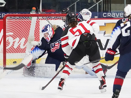 The Americans didn’t record their first shot on goal until 12 1/2 minutes into the game, and Canada continued their relentless puck pursuit. They were rewarded again at 13:50 when a mad scramble in front saw Renata Fast get her stick on the puck, which bounced crazily over the goal line to give Canada a well-deserved 2-0 lead.