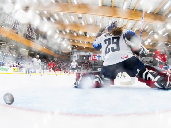 They swarmed Desbiens in the final minute, and although they couldnโt score they did draw a penalty to start the third with a power play. Canada killed that off to start the third, and teams exchanged power plays midway through the period without a goal. The Canadians had two great chances soon after, though, but the puck bounced over Jenner’s stick on one chance from the slot and Johnston wired a shot into the logo of Hensley’s sweater on the other.