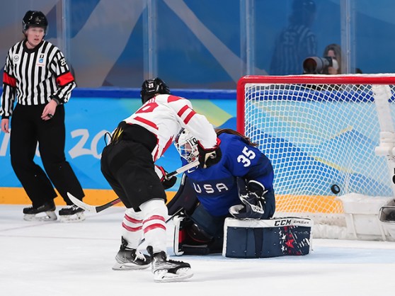 With under three minutes to pay in the middle frame, Cayla Barnes hooked Poulin on a shorthanded breakaway and the captain was awarded a penalty shot, the first one in Canadian Olympic women’s hockey history. She curled in from the left side and got the puck past Rooney’s blocker for a 4-2 lead.