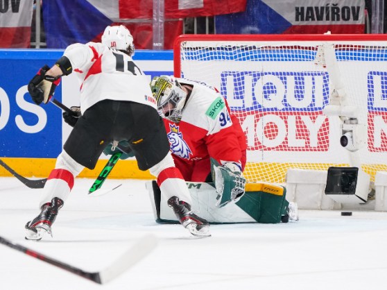Then, at 8:37, Ambühl was stationed in front of the Czech goal and made a clever tip off a Kevin Fiala pass-shot, giving the Swiss a lead. Then followed one scoring chance after another as the Czechs were on their heels and the Swiss flying high. Marco Miranda whipped a shot high from in front; Nico Hischier was stopped by Langhamer on a partial breakaway; Sven Senteler wired a shot off the post.