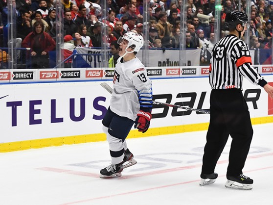 Team USA scored two goals six seconds apart late in the second period to break a 0-0 deadlock and skated to a 3-1 win over Russia tonight in Ostrava.